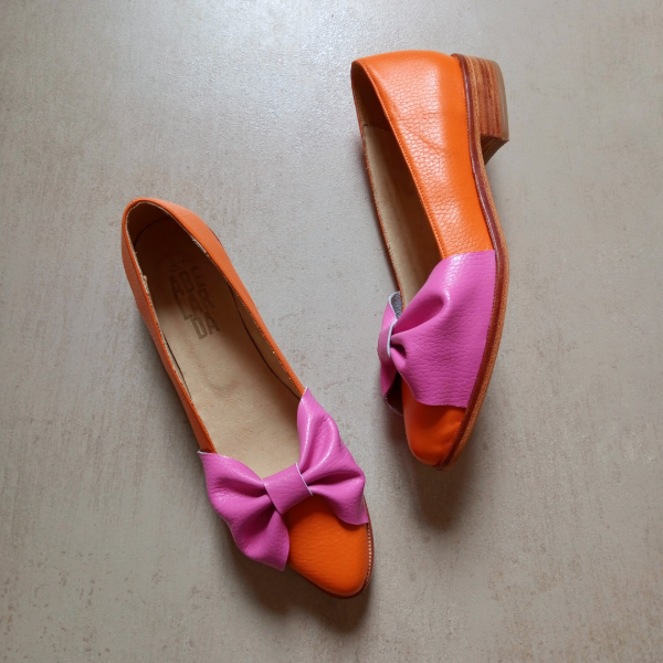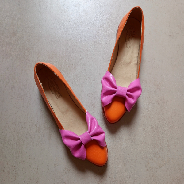Balerinas en punta de Cuero Naranja con moño Fucsia.