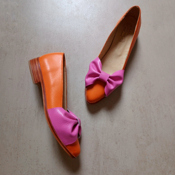 Balerinas en punta de Cuero Naranja con moño Fucsia.