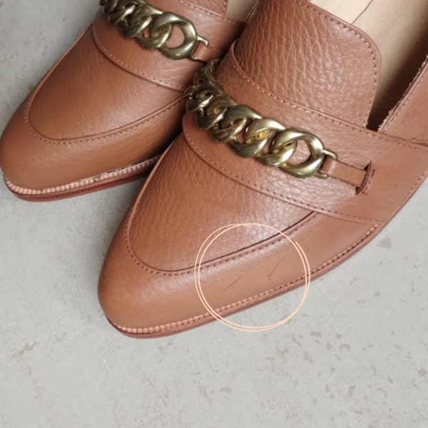 Estos zapatos tienen una falla mínima en el cuero en la puntera externa del pie izquierdo .
