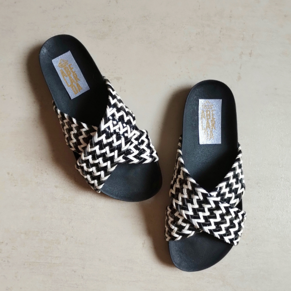 Chatas con Base anatómica super cómodas, con tiras cruzadas en material trenzado sintético Blanco y Negro.
