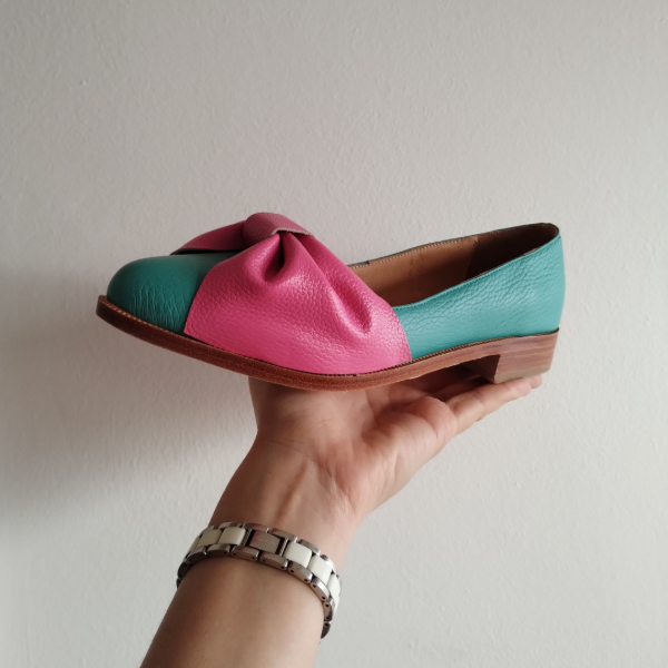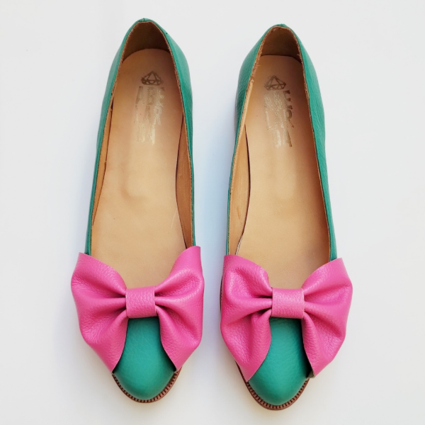 Balerinas en punta de Cuero Verde Esmeralda con moño Fucsia.